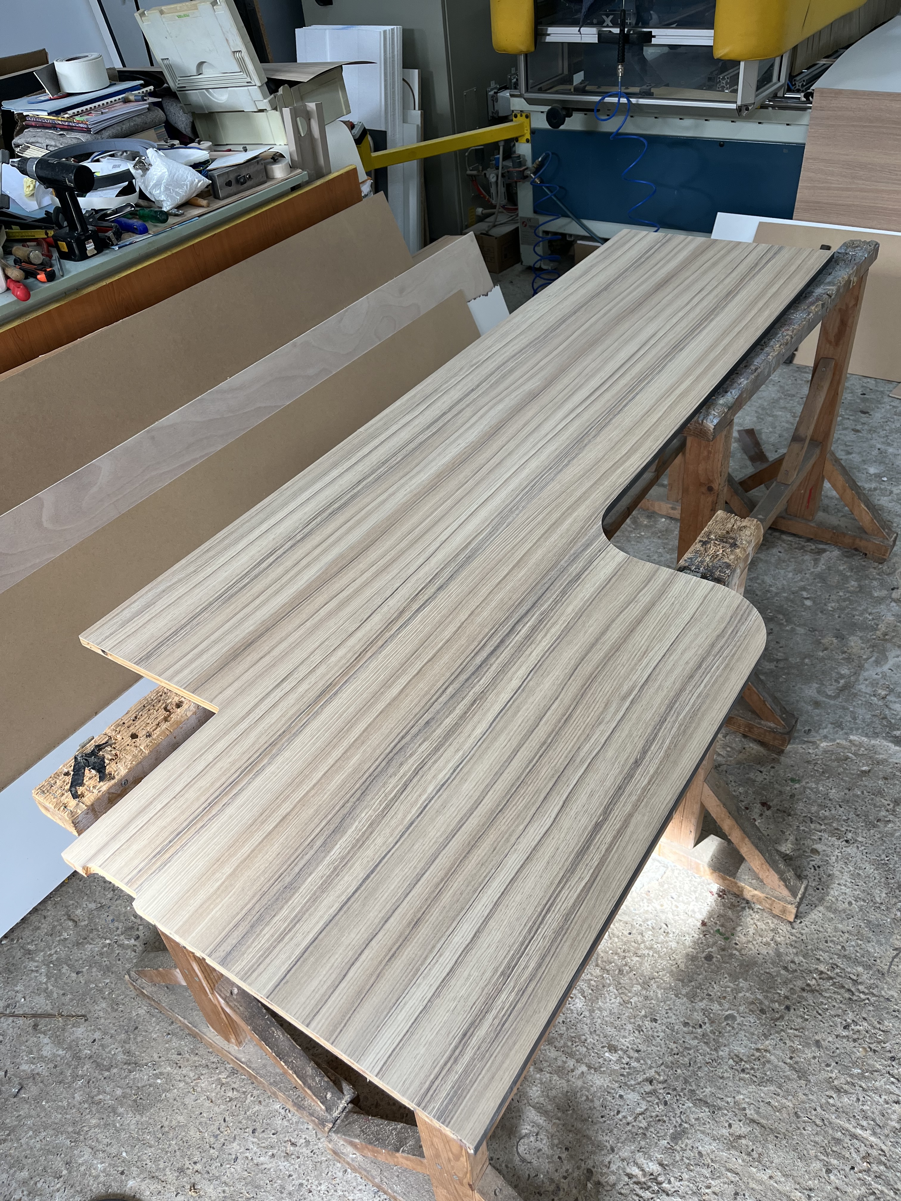 Sve stranice namještaja lijepimo odabranim dekorom ultraplasta debljine 1mm. Različite konture frezanja i lijepljenje rubnih traka.
